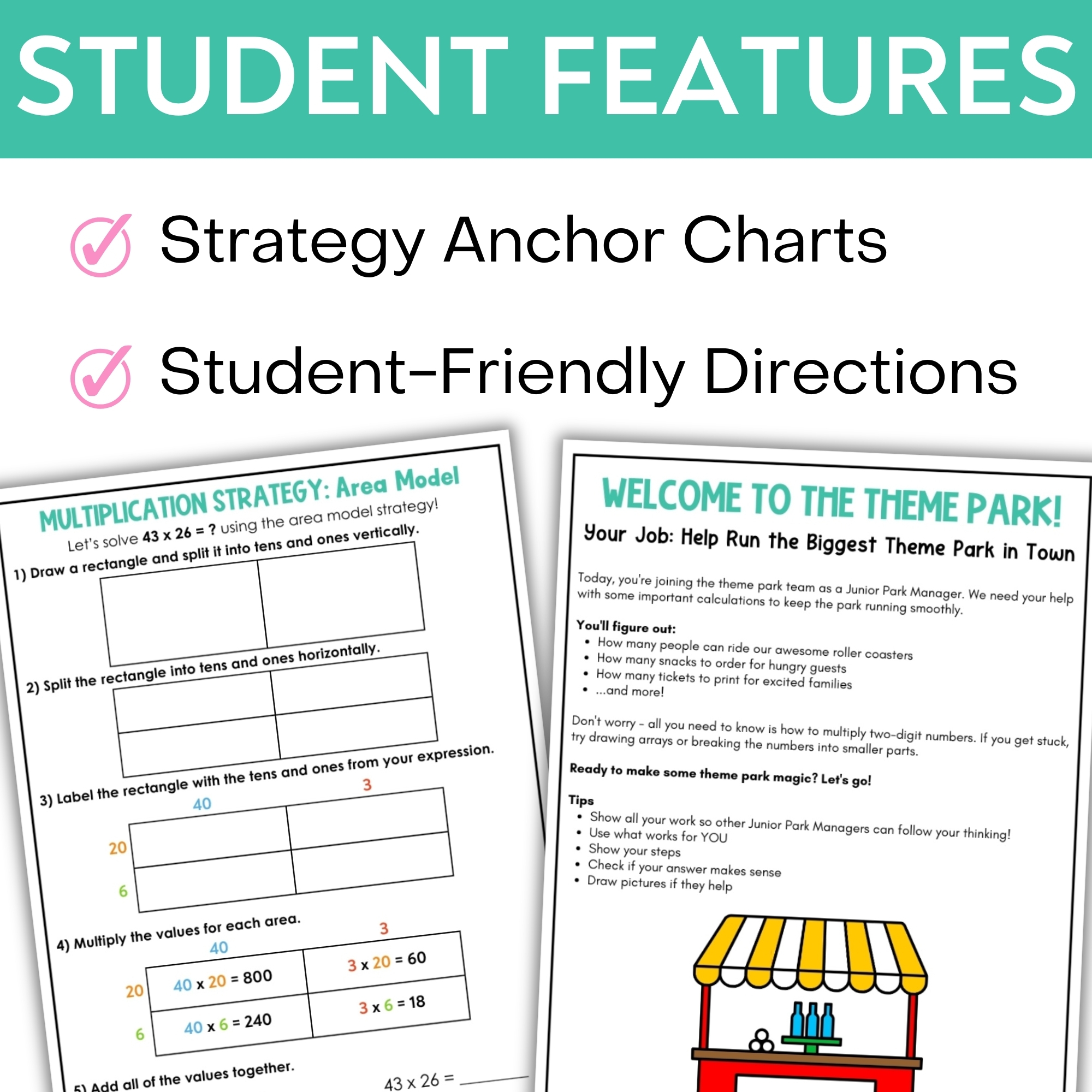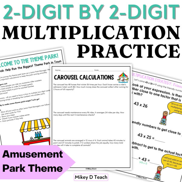 Help studentsย master 2-digit by 2-digit multiplicationย through real-world theme park scenarios they’ll love. From calculating roller coaster capacity to managing snack inventories, studentsย practice multiplication while thinking critically about reasonable answers in context.